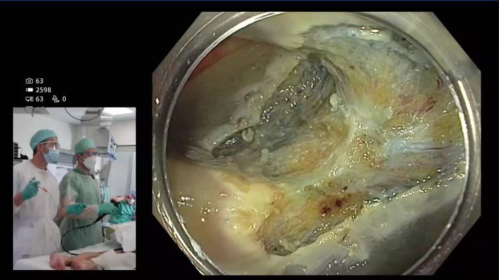 Images: Previously attempted polyp in the ascending colon. Technically difficult EMR procedure required to achieve complete clearance.